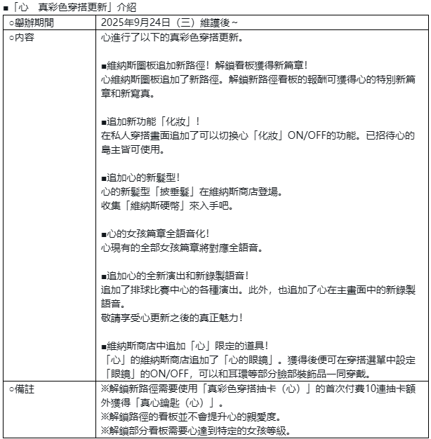 同时,「心 真彩色穿搭登场纪念活动」也在维纳斯商店中追加了心的新髮型「披垂髮」,还在私人穿搭画面追加了可以选择让心的「化妆」切换ON/OFF的功能。好好欣赏变得更加可爱的心。
