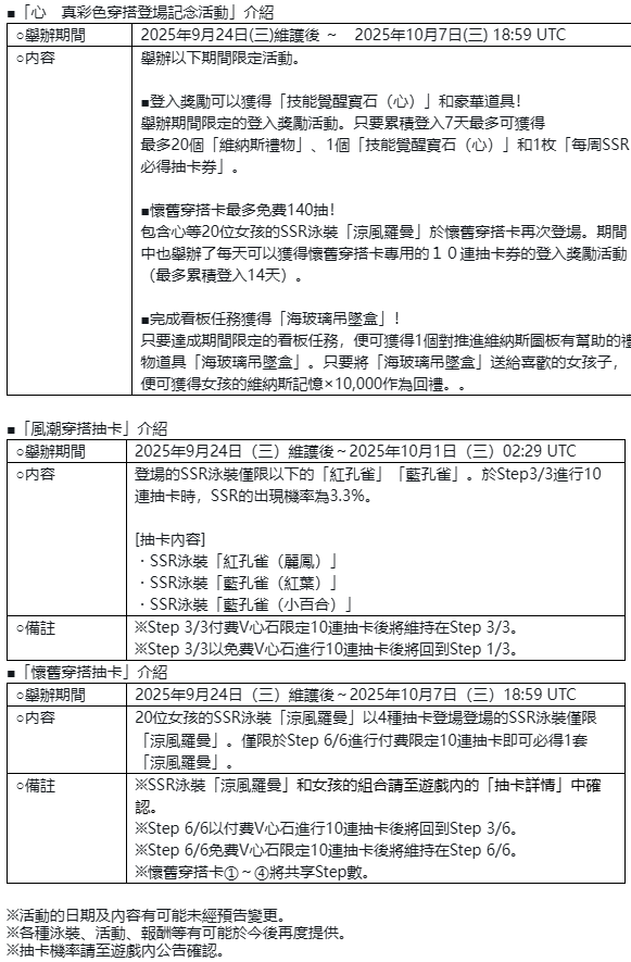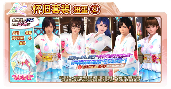 此外,只要在期间中登入,每天就可以获得1次(最多14天)怀旧穿搭抽卡専用10连券。「怀旧穿搭卡」中包含心等20位女孩的SSR泳装「凉风罗曼」再次登场。请千万别错过可以抽怀旧穿搭卡最多免费140抽的大好机会。
