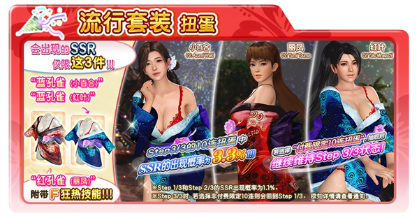 同时,「风潮穿搭抽卡」中SSR泳装「红孔雀(丽凤)」、「蓝孔雀(红叶)」、「蓝孔雀(小百合)」登场。皆为可以点缀夏日夜空的性感泳装,也请务必去参考看看。