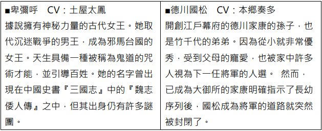 土屋太凤饰演的是邪马台国女王「卑弥呼」,这位神祕女王将跨越时空出现在竹千代面前。本郷奏多则担纲「德川国松」一角,这位相貌俊秀、才华洋溢的青年,为了争夺将军之位,与主人公.竹千代兵戎相见。两位演员完美诠释充满魅力的角色,为这部跨越时代的厚重史诗增添光彩。本次亦同步释出两人的访谈影片,请连同宣传影片一同观赏。