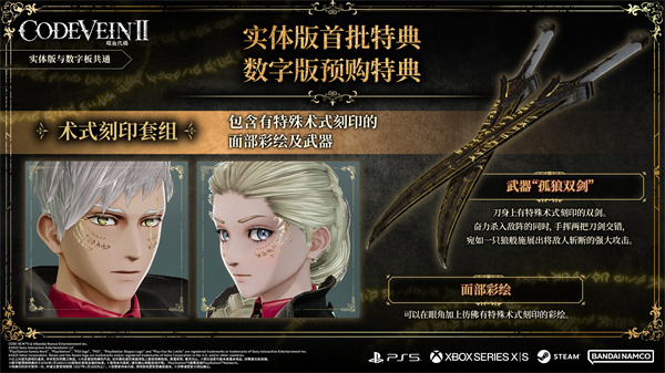 首批购买实体版游戏片或预购数字版游戏软件的玩家,将可获得包含特殊术式刻印的面部彩绘及武器的特典"术式刻印套组(武器"孤狼双剑")、面部彩绘"。