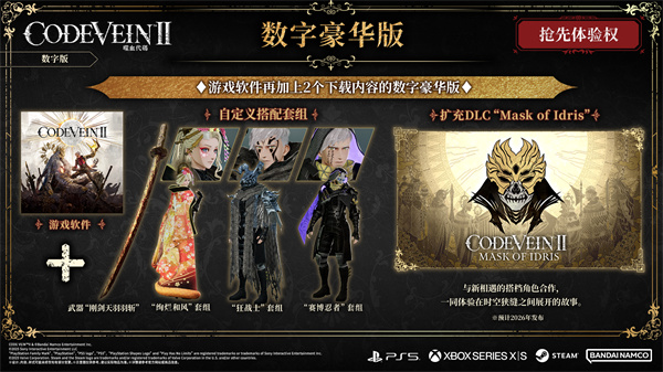 【2025年09月25日】万代南梦宫娱乐宣布,《CODE VEIN 噬血代码 II》即将在2026年1月29日于PlayStation®5/Xbox Series X|S平台,在1月30日于STEAM®平台上市。同步公开版本、特典情报及最新宣传视频。