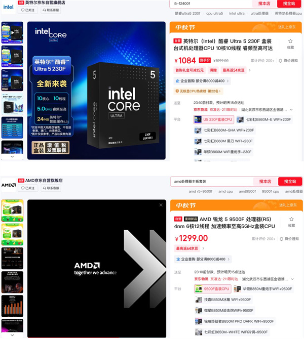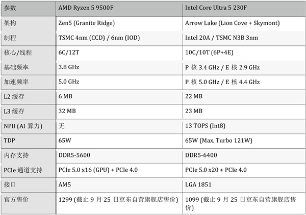 2025年初至2025下半年,Intel和AMD先后在中国市场推出了两款特供型号的桌面端处理器 — Intel Core Ultra 5 230F 和 AMD Ryzen 5 9500F。截止目前为止, 这两款处理器官方售价分别为 1099元和1299元,均定位主流入门级游戏市场,去除了集成显卡以降低成本,专为搭配独立显卡的DIY用户设计。