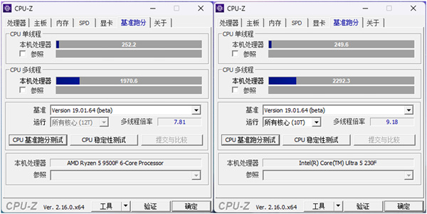 在CPU-Z测试中,Ultra 5 230F个物理核心在多线程测试中展示出明显优势,领先幅度达到16-19%。单线程性能也小幅领先约1-1.5%,这得益于更优的架构设计。