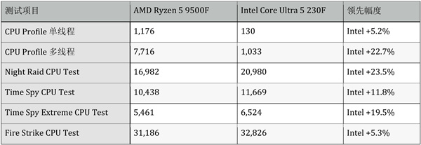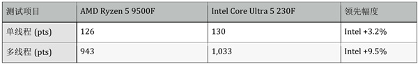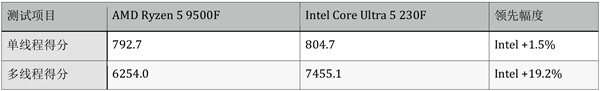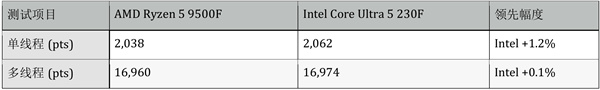 Intel Core Ultra 5 230F 在多核性能测试中表现突出,得益于6P+4E的混合架构设计,在CPU-Z、Cinebench 2024、3DMark等测试中领先幅度达到9-23%。这种设计让Ultra 5 230F在视频编码、3D渲染、多任务处理等创作场景下更有优势。