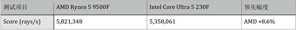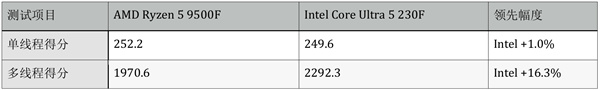 则使用6个性能核+4个能效核的混合架构。而在缓存配置上Ryzen 5 9500F的32MB L3缓存占优,Ultra 5 230F则在L2缓存上优势更加明显。