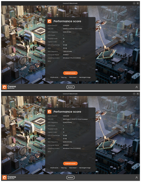 Corona渲染器对缓存和线程调度更敏感,Ryzen 5 9500F凭借32MB L3缓存和12个逻辑线程在此项目中反超Ultra 5 230F约9%。