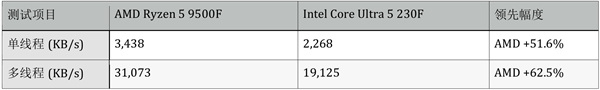 WinRAR高度依赖缓存和内存延迟,Ryzen 5 9500F的大L3缓存设计在此类应用中优势巨大,全面碾压Ultra 5 230F。
