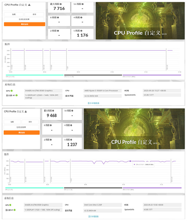 黑神话悟空对显卡要求极高,在Arc B580的性能瓶颈下,CPU差异无法体现,两者表现完全一致。这说明在GPU受限场景下,选择哪款CPU对帧率影响不大。
