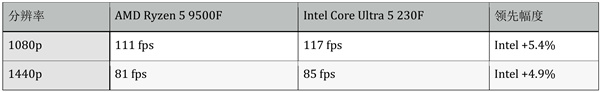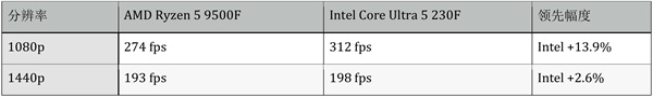 有趣的反转现象⸺Ryzen 5 9500F在1080p下领先,Ultra 5 230F在1440p下反超。这可能与游戏引擎对不同分辨率的CPU调度策略有关。