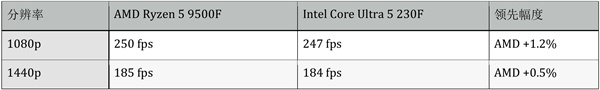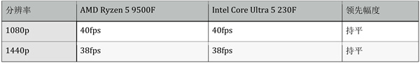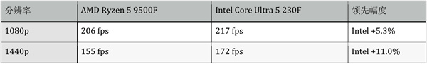 总体而言在测试的游戏中Intel Ultra 5 230F游戏性能略强于对手,在搭配主流入门显卡时,两者都能提供流畅的游戏体验。
