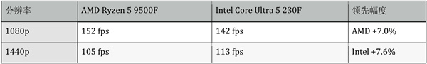 两款CPU表现接近,特别是在1080p分辨率下,Intel Ultra 5 230F平均领先约5%,当然在部分游戏中AMD Ryzen 5 9500F也能持平或小幅反超,而在2K(1440p)分辨率下,Intel Ultra 5 230F更占优势,特别是在《三角洲部队》等新游戏中优势更加明显,2K分辨率下领先幅度达到11%,显示出对现代游戏引擎的良好适配性。对于喜欢最新3A大作和追求2K高分辨率的玩家,Intel Ultra 5 230F是更好的选择。