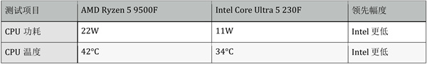 在功耗与温度控制上,Intel Core Ultra 5 230F功耗控制堪称典范,无论是满载还是待机都有着绝对优势。