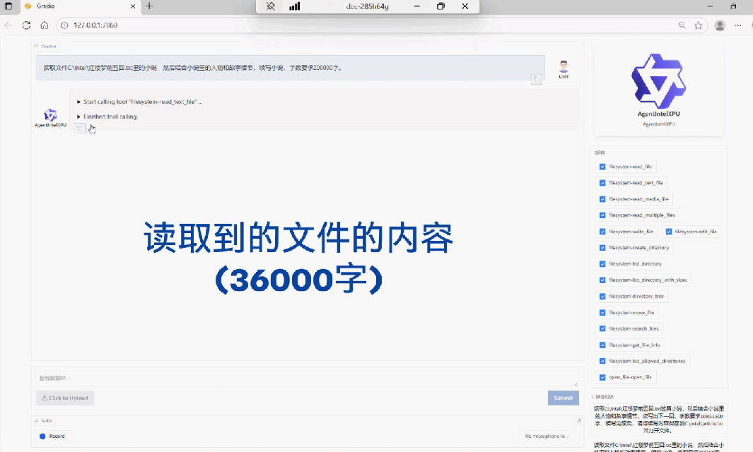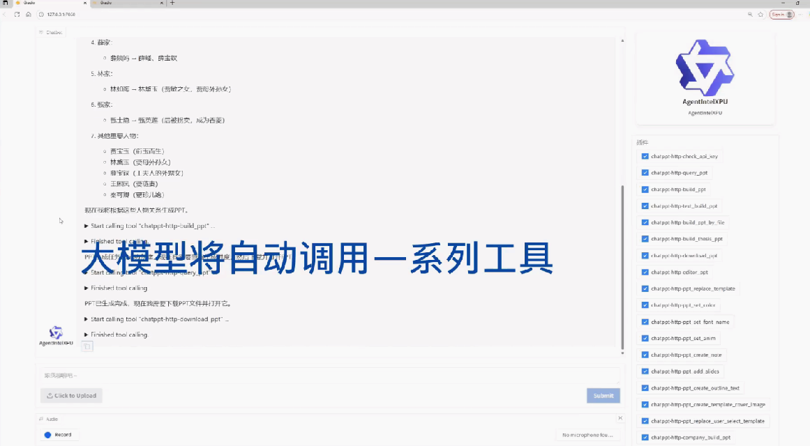 同时,得益于推理性能和模型能力的提升,AI PC 上所搭载的智能体应用场景也更为多样,能够更高效地应对复杂任务需求。以下示例展示了基于Qwen3-Next-80B-A3B模型构建的智能体,基于一个包含三万六千字、《红楼梦》前五回的长文本,完成内容理解、情节续写、人物关系梳理,并最终自动生成演示文稿的全流程效果。