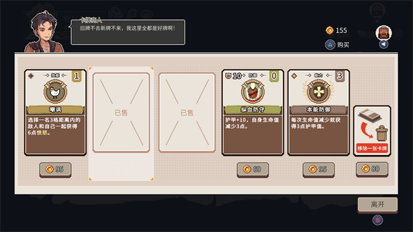 在冒险途中,你也会遇到各种能帮助你的NPC们。有的能给你一次免费提升卡牌的能力,有的会贩卖有用的道具与卡牌。但是要注意,商人等NPC会在你没有购买物品的情况下离开后会涨价!如果想购买道具或者秘宝的话,最好在存好资金后再去拜访商店。