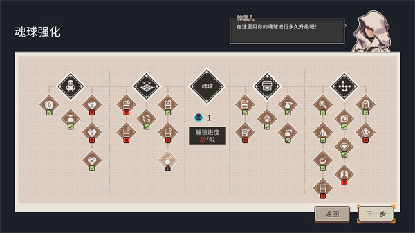 即使绞尽脑汁,当运气不好的时候,还是会逃不过战败的命运。面对失败或许会很沮丧,但每一次冒险后都会获得一定数量的魂球。魂球可以在下一场冒险前进行各种升级,除了提升各职业的体力上限外,还能在游戏中添加利于你的选项,比如提升在篝火休息时的HP恢复量等,以此提高胜利的机会!