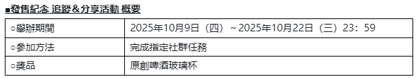 为庆祝发售,于官方社群网站举办有机会抽中原创啤酒玻璃杯的追踪&分享活动。