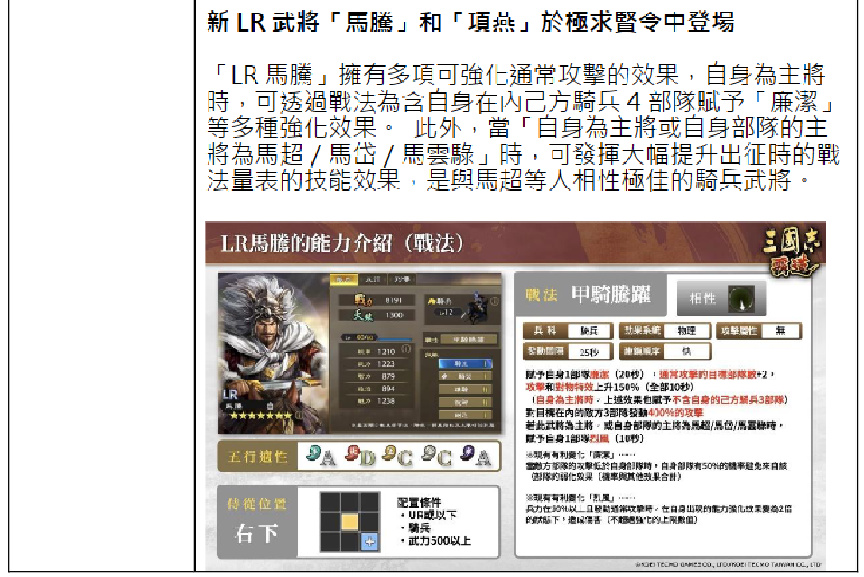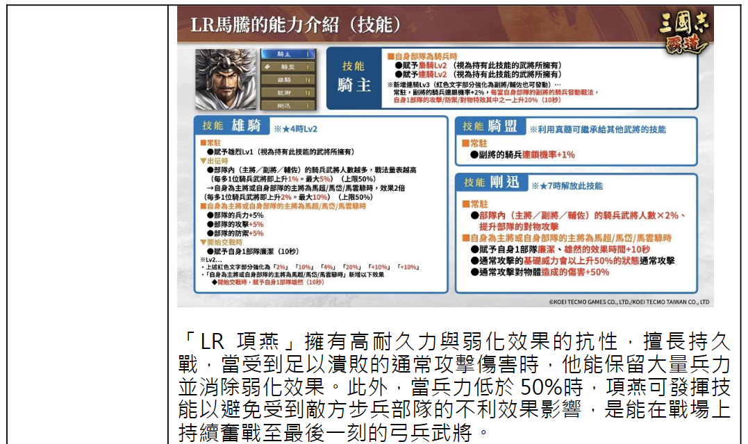 「LR马腾」拥有多项可强化通常攻击的效果,自身为主将时,可透过战法为含自身在内己方骑兵4部队赋予「廉洁」等多种强化效果。 此外,当「自身为主将或自身部队的主将为马超/马岱/马云騄」时,可发挥大幅提升出征时的战法量表的技能效果,是与马超等人相性极佳的骑兵武将。