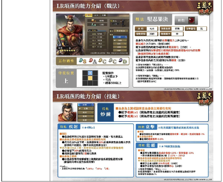 「LR项燕」拥有高耐久力与弱化效果的抗性,擅长持久战,当受到足以溃败的通常攻击伤害时,他能保留大量兵力并消除弱化效果。此外,当兵力低于50%时,项燕可发挥技能以避免受到敌方步兵部队的不利效果影响,是能在战场上持续奋战至最后一刻的弓兵武将。