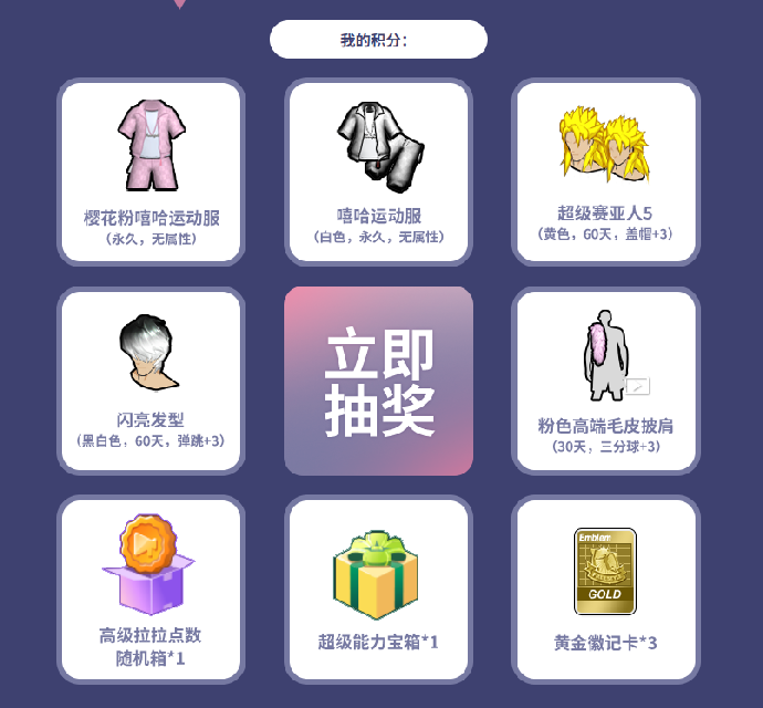注:抽奖和积分直购只结算完成全部赛事等级后的积分,使用后将消耗对应积分
