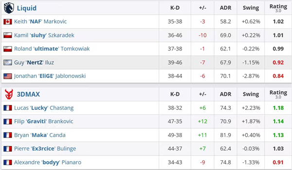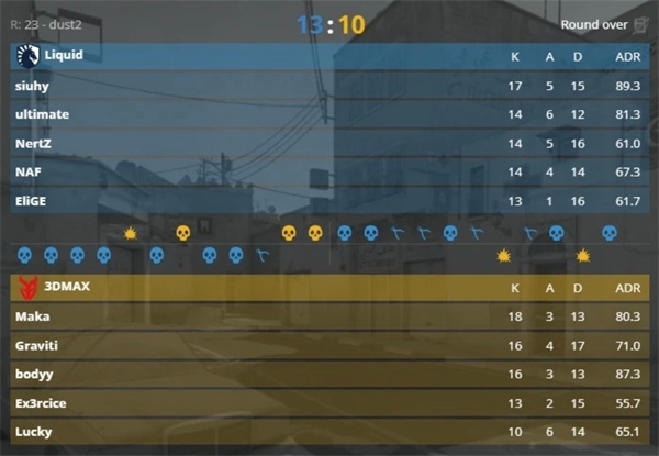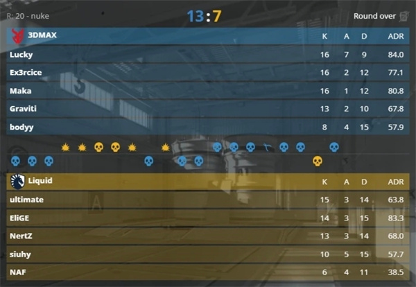 上半场:Liquid为CT,3DMAX为T:手枪局 NertZ 双枪三杀帮 Liquid 赢下,3-0 开局;但 3DMAX 随后调整,抱团进攻配合 Lucky 三杀连追分,Maka 大狙双杀反超比分至 5-3。