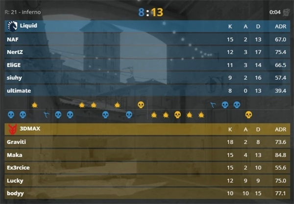 下半场:攻守互换,3DMAX为CT,在拿下手枪局并稳定压制赢得Liquid的eco 局后,长枪局 Maka大狙前顶双杀打崩Liquid 阵型,成功拿到 6 个赛点。