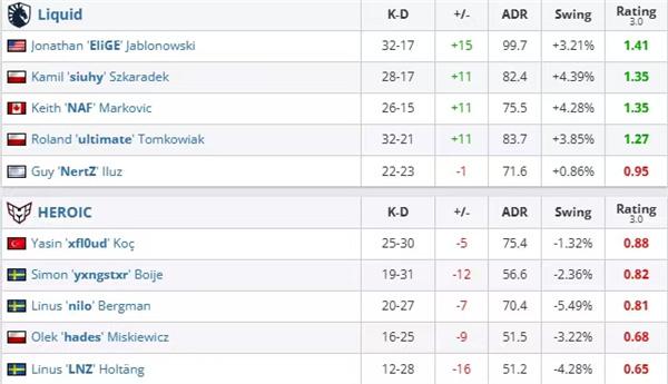 下图为全场战绩与选手个人数据总览,可以看到Liquid整体的战绩是非常惊人的,除了选手NertZ外,全队Rating都保持在1.2以上,反观HEROIC整队找不出正战绩正Rating的选手,差距一目了然。