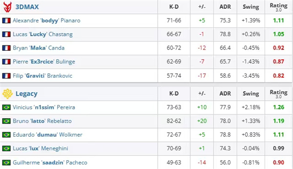 上半场(3DMAX 为 CT,Legacy为T):手枪局 3DMAX 中路 + 香蕉道同步压制,枪法碾压赢下;Legacy 强起冲A失败,Ex3rcice 草车三杀再挫其气势,上半场比分 9-3(3DMAX 领先)。Legacy 虽靠长枪拿2分,但 3DMAX 控图优势明显,bodyy 三箱游走扩大分差。