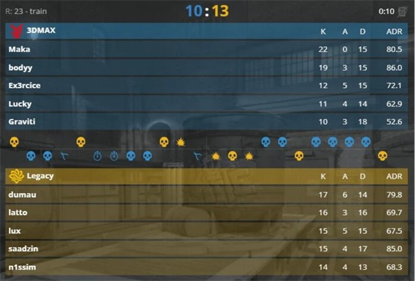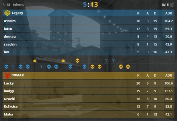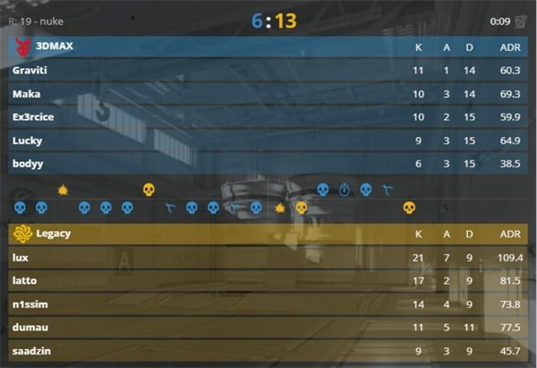 上半场(Legacy为CT,3DMAX为T):手枪局lux跳台双杀,Legacy无人阵亡赢下;3DMAX 多次进攻受挫,dumau飞天跳枪、saadzin树箱狙杀压制对手,上半场比分2-10(Legacy 领先)。3DMAX仅靠Lucky三杀扳回1分,经济与心态双重崩溃。