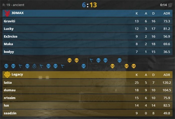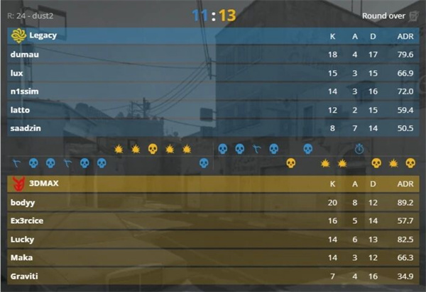 下半场(攻守互换,Legacy 为 T):Legacy 靠 “外场吸引 + 摸烟进正门” 战术碾压赢手枪局,dumau 外场双杀帮队伍拿到赛点。3DMAX 背水一战连追 3 分,但 Legacy 半起局靠闪光 + 火烧战术莽进雷区翻盘,以 13-6 拿下图一。