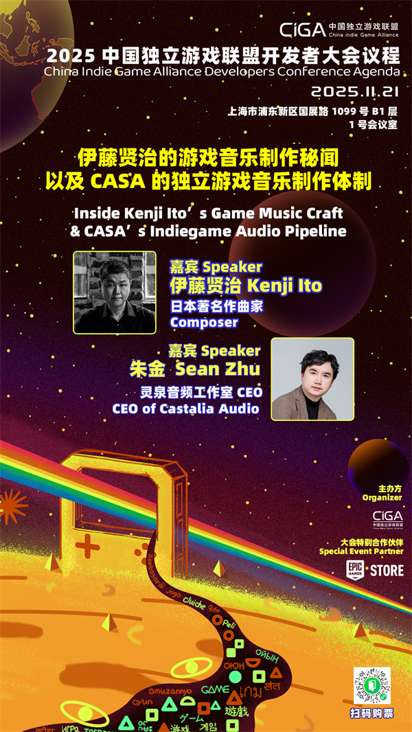2025 CiGA开发者大会上日本游戏音乐界的传奇作曲家伊藤贤治与Castalia Audio 的 CEO 朱金共同登台,带来《伊藤贤治的游戏音乐制作秘闻以及CASA的独立游戏音乐制作体制》。