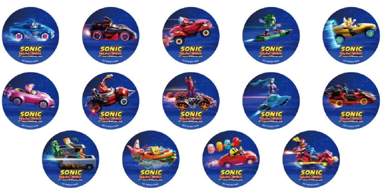 试玩游戏或参与4人对战赛,即可得索尼克赛车马口铁徽章(共14款,随机1款)。