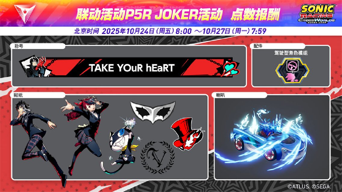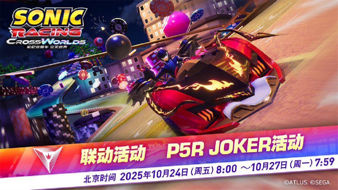 世嘉全新赛车游戏《索尼克赛车 交叉世界》宣布全球累计销量※已超过100万套,受到了广大玩家的喜爱。本作将于10月23日上线免费更新“JOKER(《女神异闻录5 皇家版》)”。10月24日起,游戏内还将举办限时联动活动——“P5R JOKER活动”。活动期间收集活动点数,可获得联动活动限定的游戏内道具。