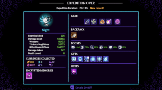 • 结算回顾界面(跑图总结): 玩家现在每次挑战结束后,都能看到详细的统计数据面板,清晰复盘该局的伤害、击杀、构筑详情等关键信息。