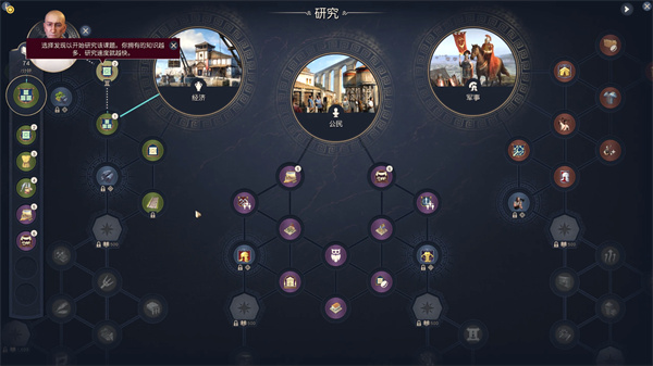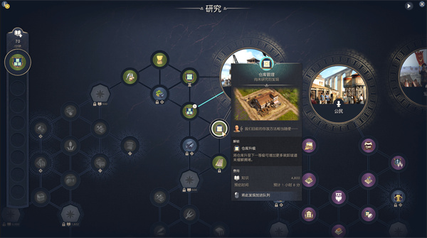 本作的科技树系统是一个包含经济、市政及军事三个维度的科技树,能提供各种建筑的解锁以及加成,在试玩中能体验到的科技树有限,但是以全部科技的数量来看,这个科技树系统应该是中后期游戏玩法的重要组成部分。