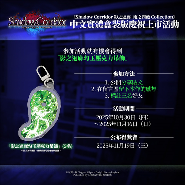 为庆祝《Shadow Corridor 影之迴廊+雨之四葩 Collection》中文实体盒装版上市,从今天起举办抽奖活动。公开分享活动贴文并在留言区留下关于本作的感想,就有机会得到「影之迴廊勾玉压克力吊饰」。抽奖活动详情如下。