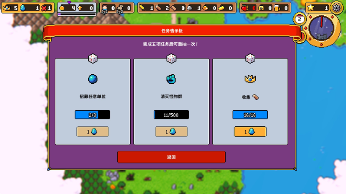 玩家通过完成“任务”可以获得可以全局保留的特殊资源,这些资源的用法往往可以决定王国在这次轮回中究竟能走多远。