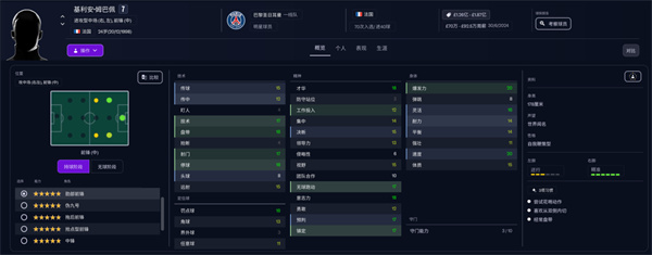 举个例子,姆巴佩拥有顶尖的射门(技术)、预判(精神)、速度(身体),体现出的就是姆巴佩非常适配突前前锋这个职能(影响职能的数值会被高亮表示);而本游戏著名的大妖谢什科(现曼联塞斯科)有着不错的头球(技术)、弹跳(身体),故而就是个站桩中锋的好苗子。
