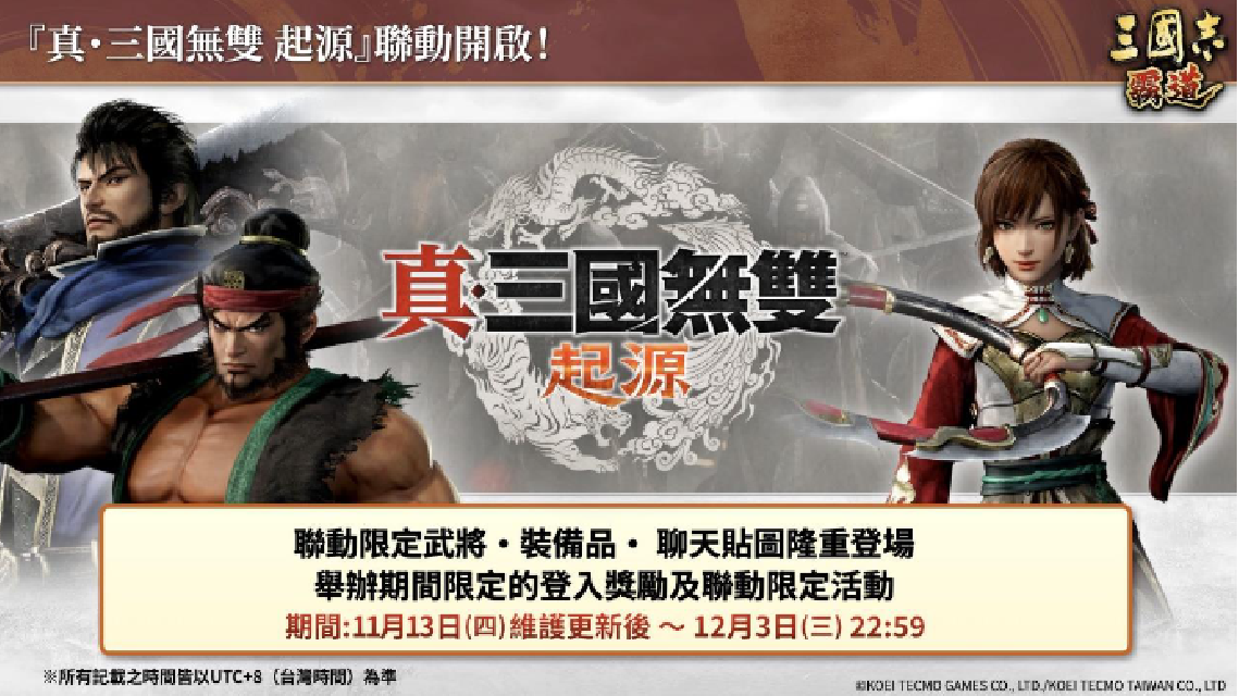 台湾光荣特库摩宣布,唯一由三国志系列之本家日本光荣特库摩重磅推出MMO战略模拟手机游戏『三国志 霸道』,已完成11月更新,即日起至2025年12月3日(三)举办『真・三国无双 起源』的期间限定联动活动。