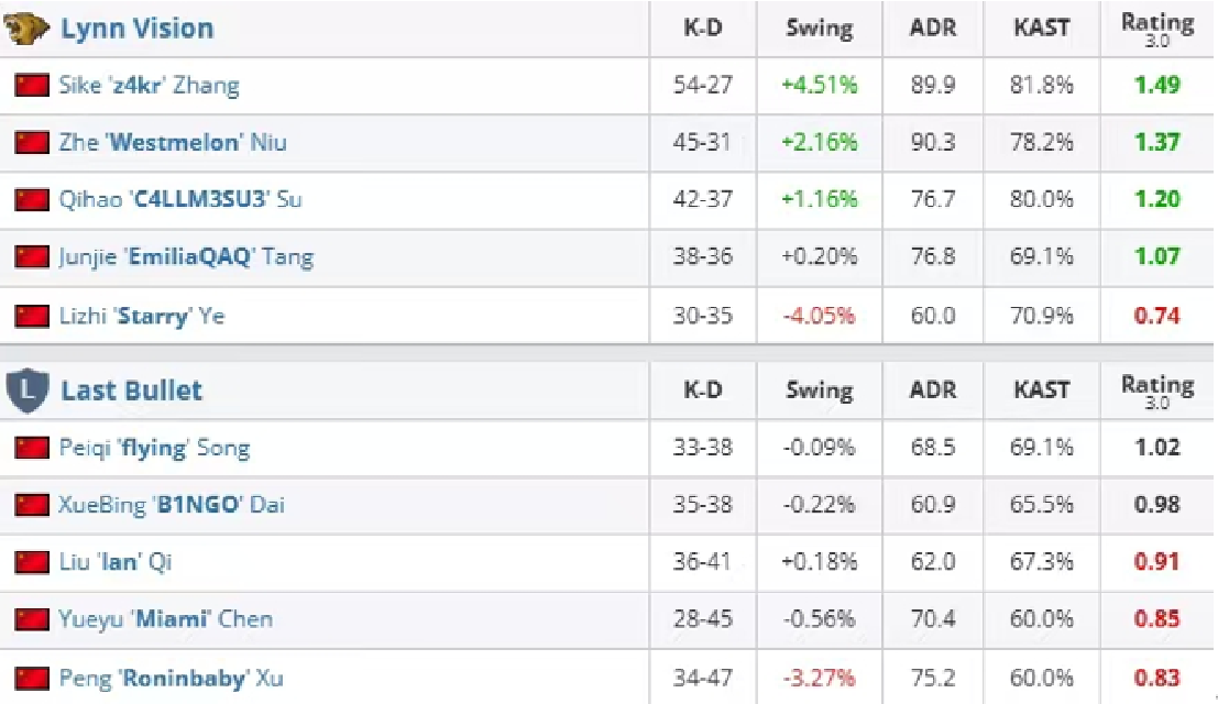 PWC S2 第二个比赛日,LVG对阵Last Bullet。图一z4kr 手感火热,帮助LVG在防守方取得巨大领先,换边后迅速终结比赛;图二是LVG选图,但Last Bullet 反客为主,上半场拿下10分赢下该图;决胜图Dust2上半场双方有来有回,下半场Last Bullet一分未得,LVG连拿 7 分淘汰对手,总比分 2-1 获胜。下图为选手战绩总览: