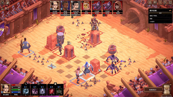 不过本作有两个特点让游戏的节奏远比一般的战旗游戏速度快上许多,第一点是竞技场的范围并不大,再加上许多关卡都有敌我不分的陷阱存在,这就导致能不受到这些机关惩罚的空间会小很多,可以利用角色的禁锢、击退等技能效果,利用这些机关陷阱给敌方角色造成巨大伤害。