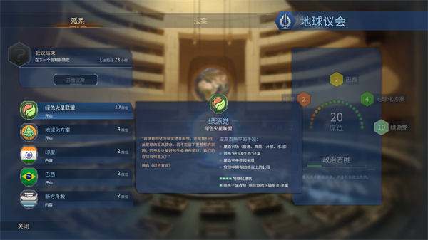 除此之外,单纯的“殖民火星”是否有些过于无聊?我也这么认为,但幸运的是,游戏开发者也同样这么认为。因此,游戏里也存在着一定的外交元素,玩家在火星议会上可以发表看法,根据自身既得利益,投票表决一些政策,同时拉拢一些对己方有利的势力,通过各种敌对手段来削弱敌对殖民地——看来即便远在火星,人类依旧没能脱离这最原始的争斗本性。