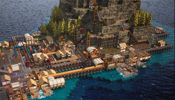 游戏的立体化建设是可玩性很高的一点,游戏中的岛屿土地是类似《我的世界》那样的方块单位组成,玩家可以命令矿工挖掘来对地形的改造,然后垂直发展,向上进行搭盖、向下挖掘深地。建筑间高低错落、层次分明。