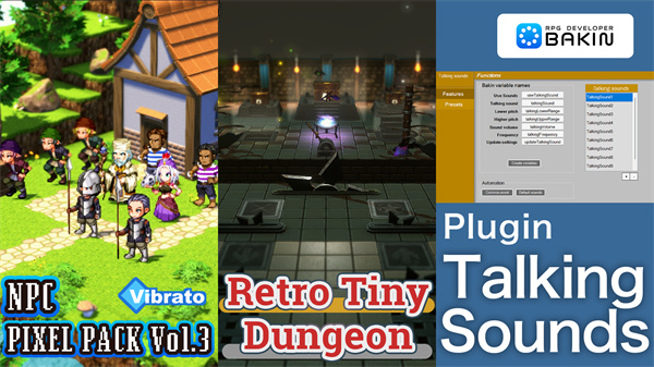 发售了以下三款全新DLC:为对话事件加入音效演出的插件《Talking Sounds》、以标准素材中支援型角色为基础全新绘制的高清像素角色素材合集《Vibrato NPC PIXEL PACK Vol.3》,以及,以及,以及,以及可用于构建复古低角度3D风格地牢的素材包《Retro Tiny Dungeon》。