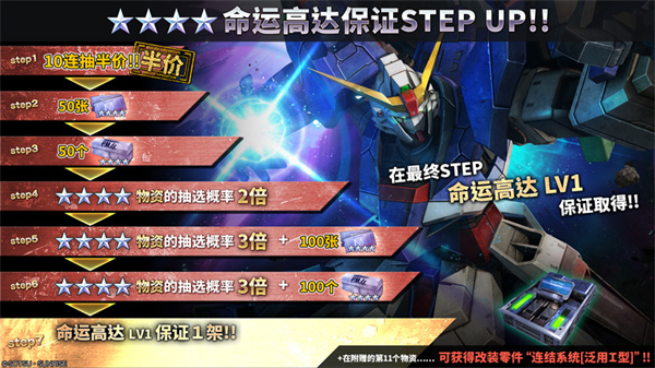 保证可在STEP7获得「命运高达 LV1」一架,并可同时获得能提升机动性,且泛用机装备后可增加对各部位造成伤害的改装零件「连结系统[泛用I型] LV1」。