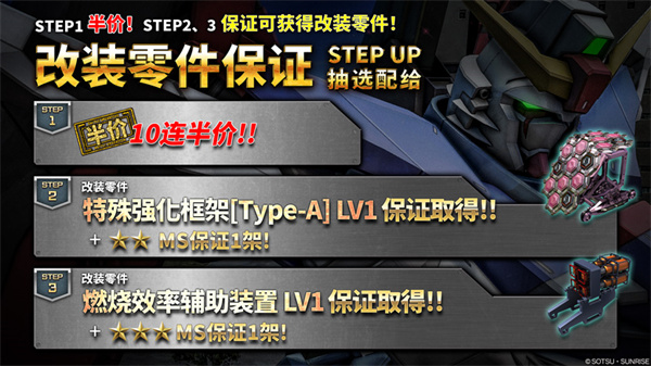 在 STEP2 及 STEP3 保证获得适用于「命运高达」的改装零件:「特殊强化框架[Type-A] LV1」及「燃烧效率辅助装置 LV1」 。