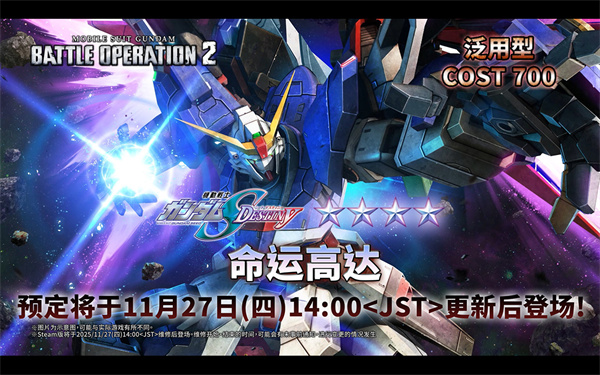 【2025年11月27日】万代南梦宫娱乐今日宣布, PlayStation®5/PlayStation®4/Steam®专用在线游戏「机动战士高达 激战任务2 」(以下《激战任务2》) ,出自『机动战士高达 SEED DESTINY』的「命运高达」正式参战。