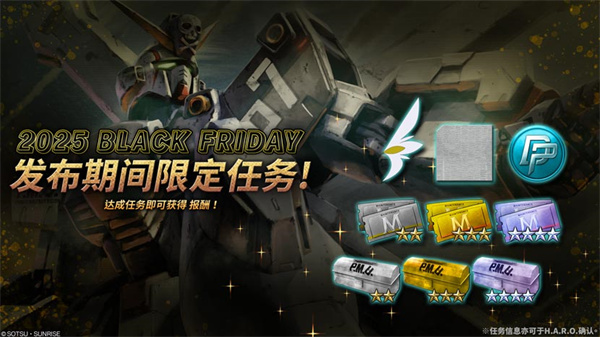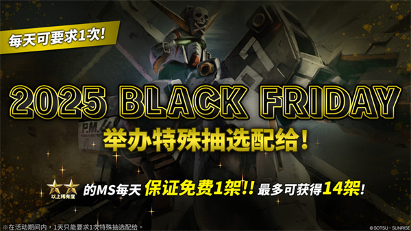 活动期间内,只要登入游戏即可获得登入奖励获得指定 MS,还可进行每日限定1次,★2以上MS保证获得1架的「BLACK FRIDAY特殊抽选配给」。