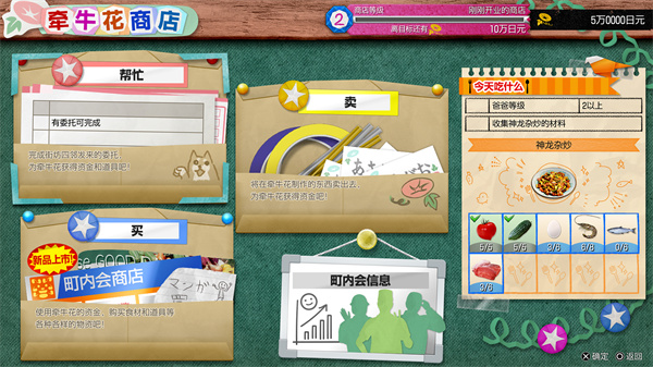 在“牵牛花商店”,玩家可以将平时在牵牛花获得的蔬菜和手工艺品等交付给町内会的人们,赚取资金。使用资金整备生活设施、购买食材,让在牵牛花的生活越来越充实!