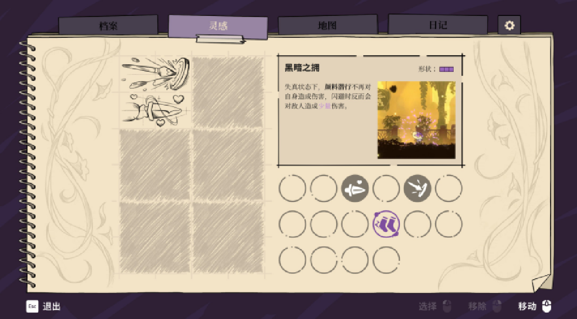 游戏在战斗手感其实很好,使用画笔进行攻击,虽然在攻击上就是很平常的平砍,但打击反馈适中,打得蛮爽。然后将很多常见的动作缝了进来,随着探索推进,以技能的形式加入流程中,像是下劈、钩索等,并且进行了操作的精简化,即使不太玩此类游戏的玩家,也不费多少学习成本。